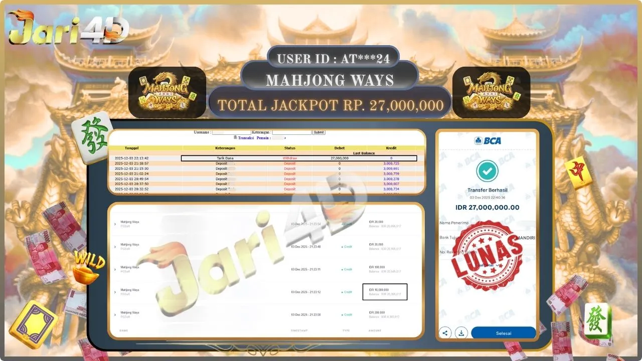 Bukti JP MAHJONG WAYS Hari ini Di Situs JARI4D Sebesar Rp.27,000,000,- Tuntas !!