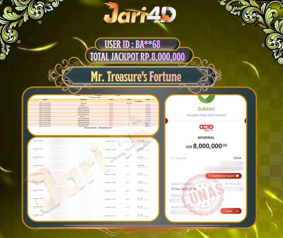Bukti JP Mr. Treasures Fortune Hari ini Di Situs JARI4D Sebesar Rp.8,000,000,- Tuntas !!