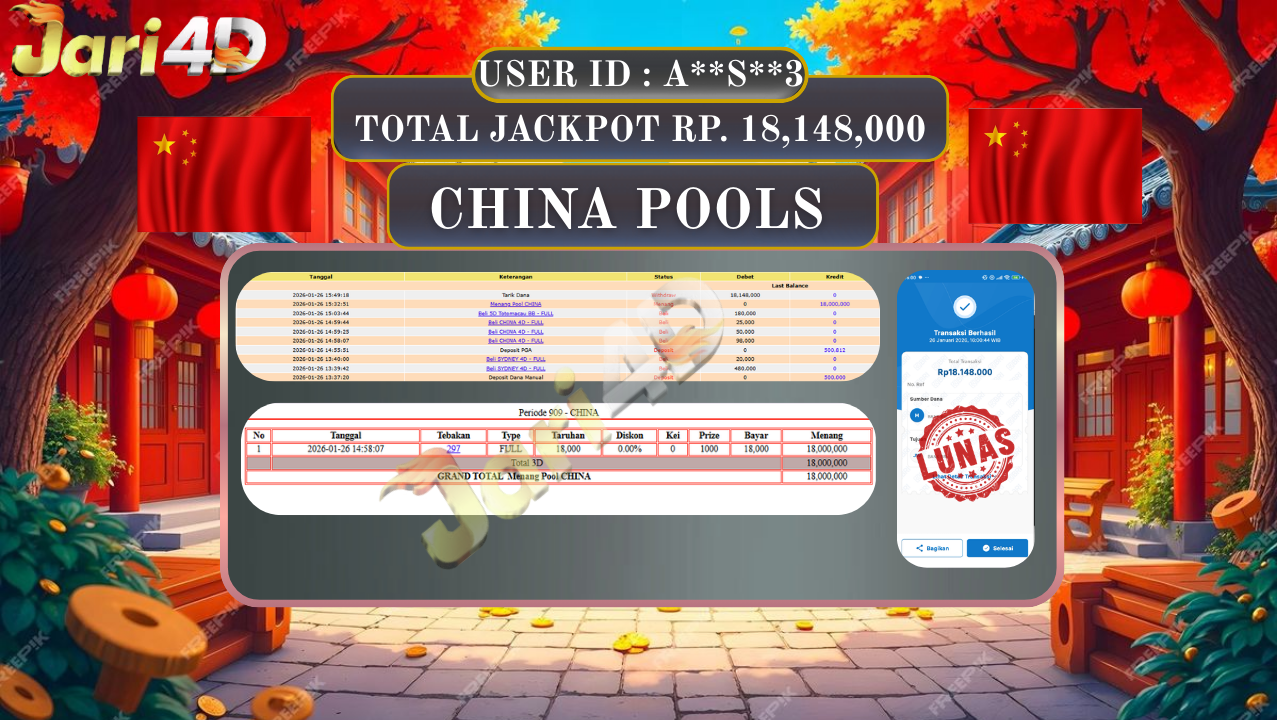 BUKTI WITHDRAW JARI4D KEMENANGAN JACKPOT CHINA POOLS Rp.18.184.000,- LUNAS