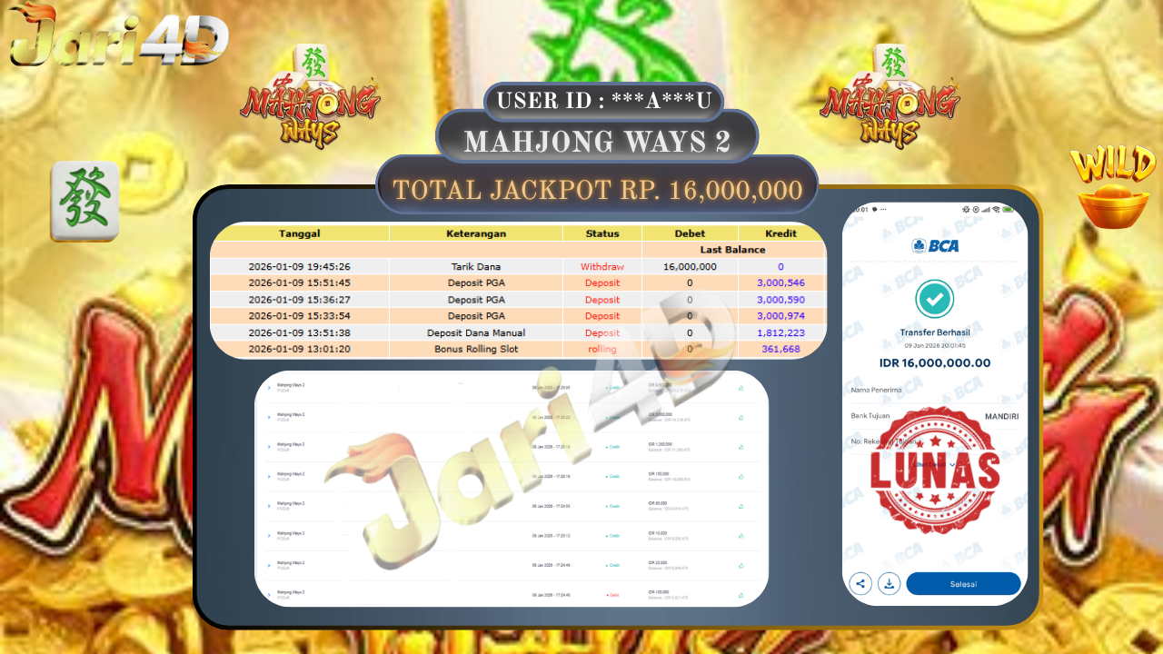 BUKTI WITHDRAW JARI4D KEMENANGAN JACKPOT MAHJONG WAYS 2 Rp.16.00.000,- LUNAS