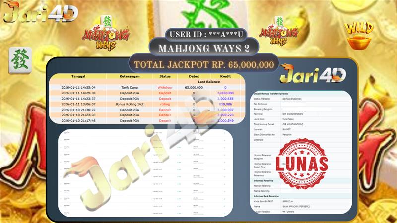 BUKTI WITHDRAW JARI4D KEMENANGAN JACKPOT MAHJONG WAYS 2 Rp.65.000.000,- LUNAS