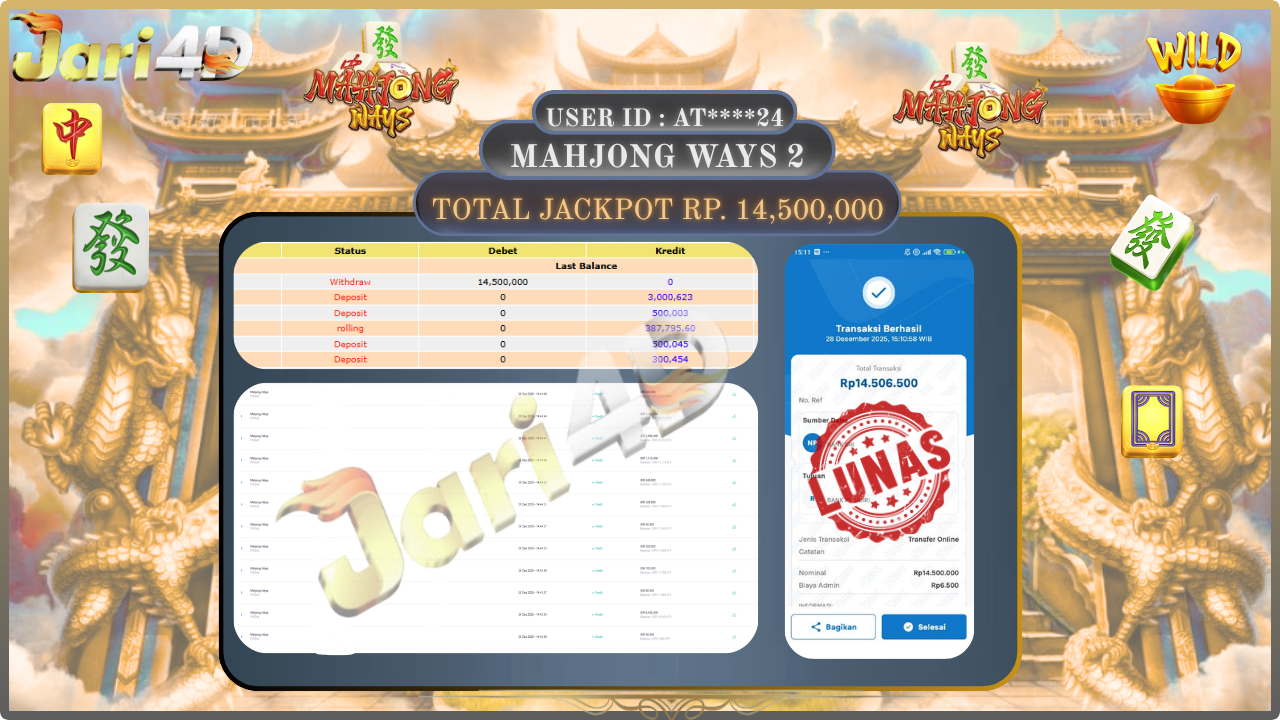 BUKTI WITHDRAW JARI4D KEMENANGAN JACKPOT MAHJONG WAYS2 Rp.14.500.000,- LUNAS