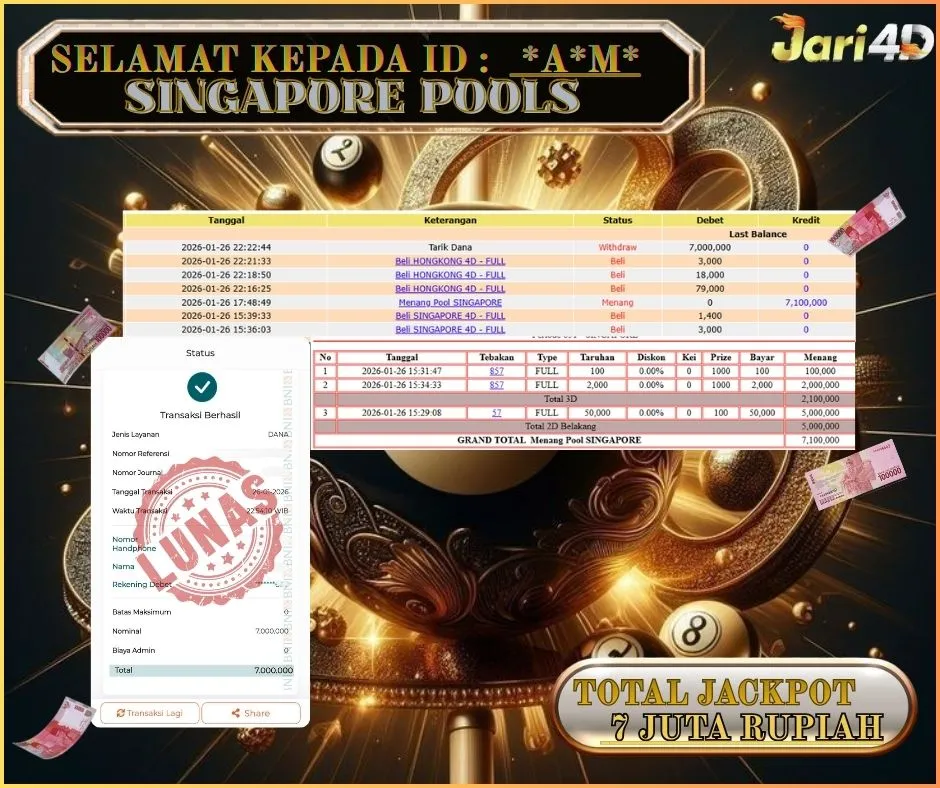 BUKTI WITHDRAW JARI4D KEMENANGAN JACKPOT SINGAPORE POOLS Rp.7.000.000,- LUNAS